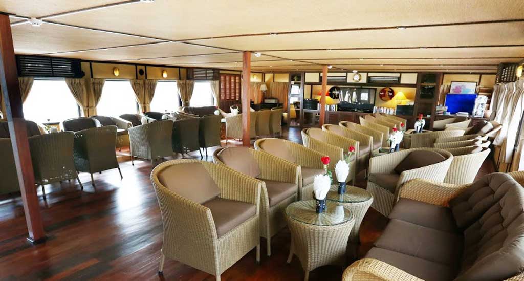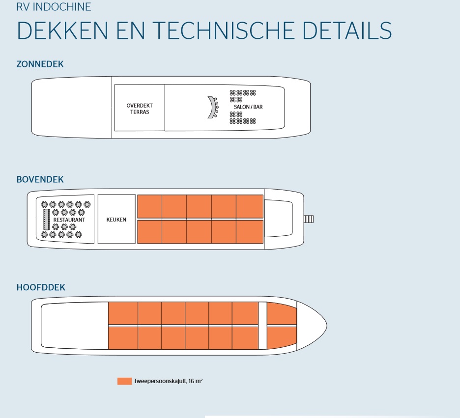 • Afhankelijk van de hoogte van het water en de getijden, kunnen passagiers in- en ontschepen aan boord van de RV Indochine II vanaf de mini-terrassen van kajuiten 221 en 224 (gelegen aan de achterkant van het bovendek).